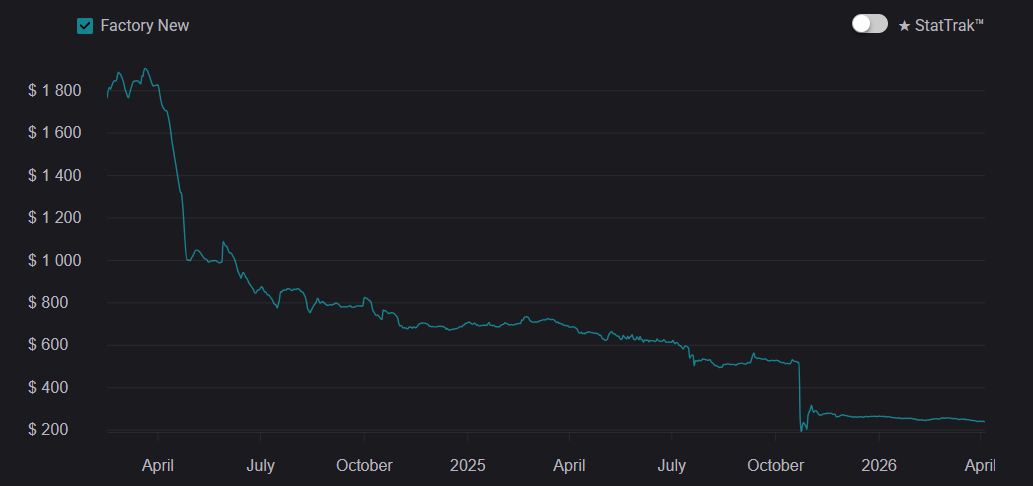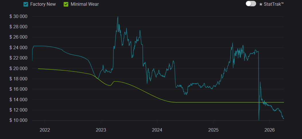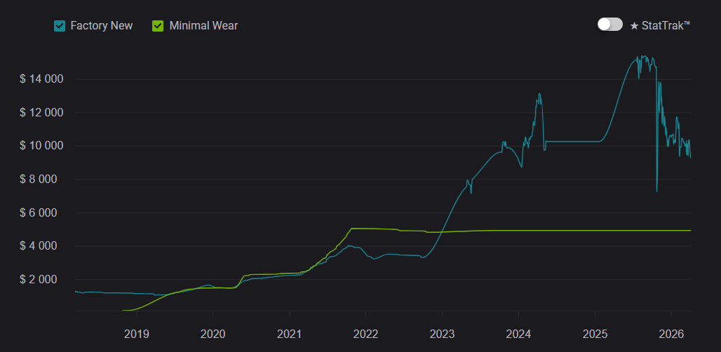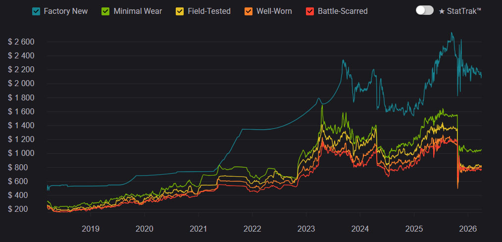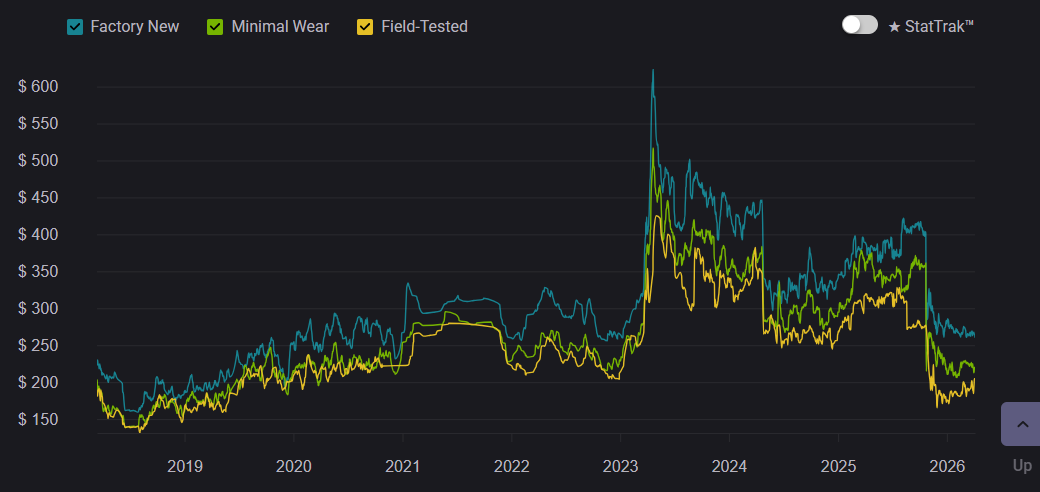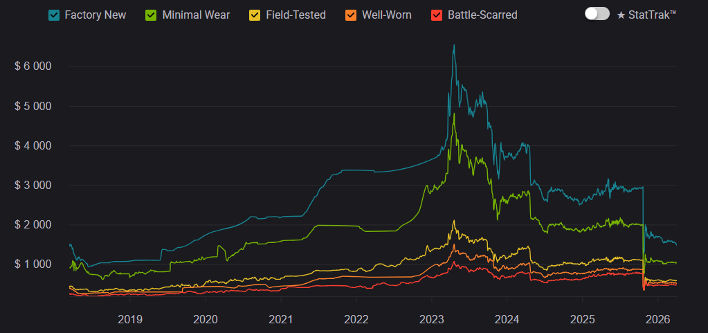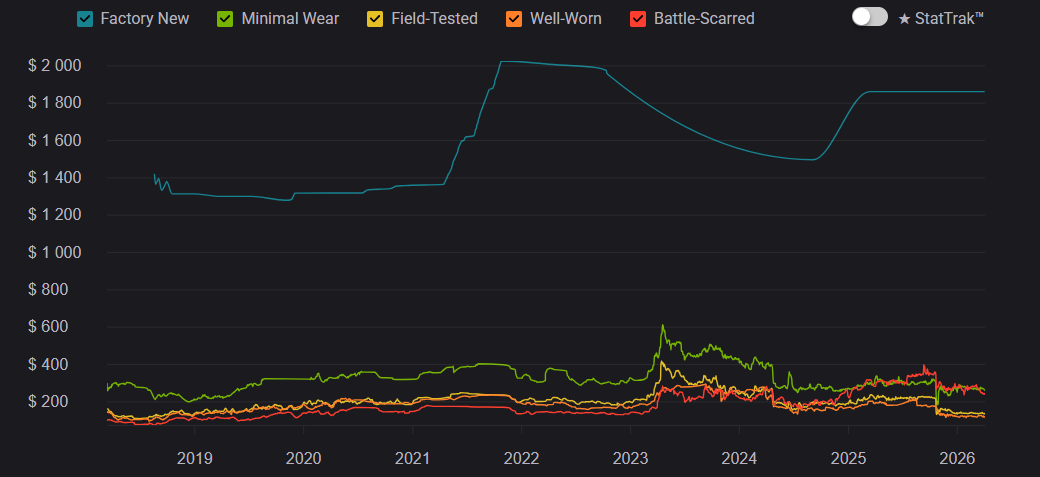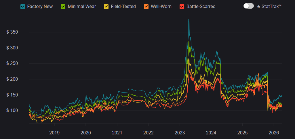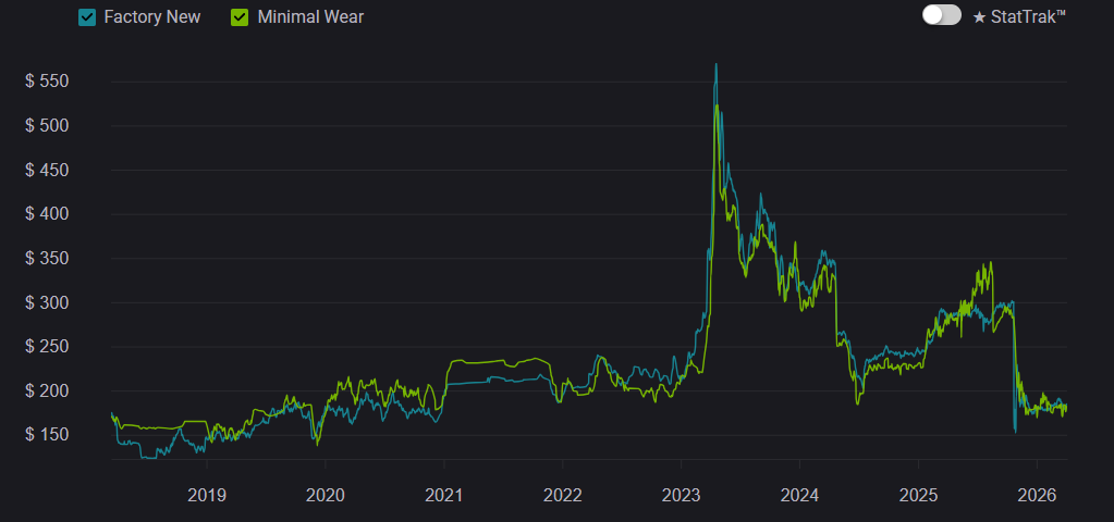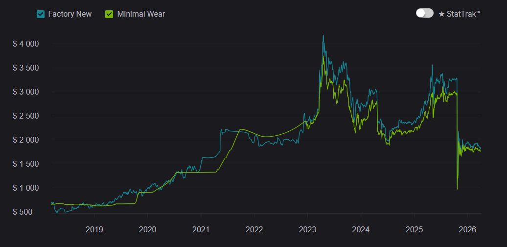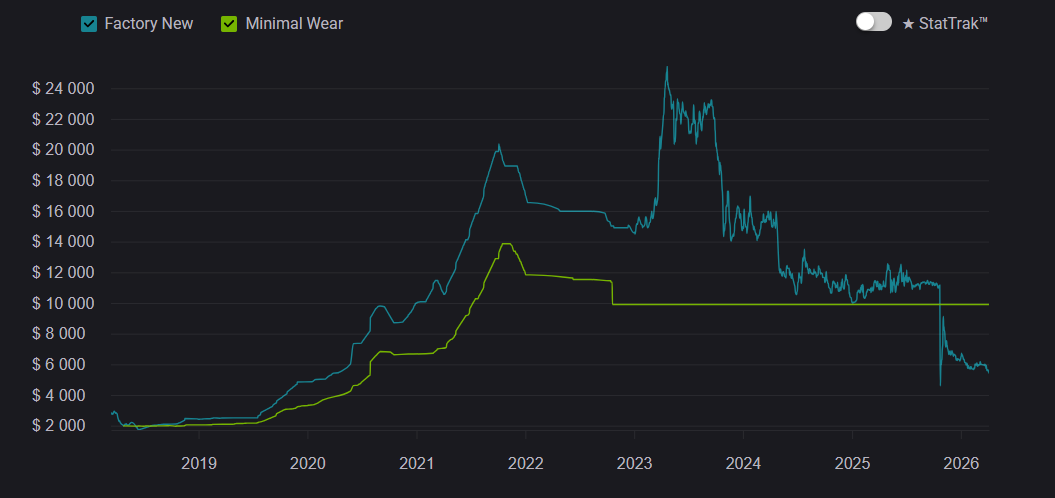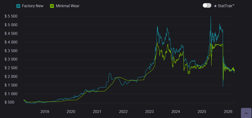 At launch, Gamma Doppler was seen as a niche alternative to classic Doppler skins, but over time it became one of the most prestigious options. Between 2020–2023, demand steadily increased, and by 2026 it remains a top-tier choice. But prices across all Gamma Doppler phases have slightly decreased. This is largely due to crafting, where there is a 25% chance to upgrade an AK-47 | Nightwish from the Dreams & Nightmares Case into a Butterfly Knife.