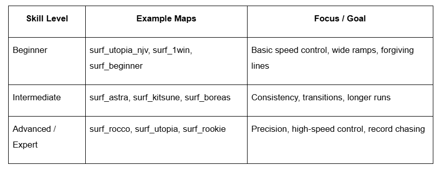 Picking the right map is key to improving in CS2 surf. Too easy, and you’ll get bored; too hard, and frustration will stall your progress. Here’s a simple way to know when to step up and how to rotate maps for better learning.