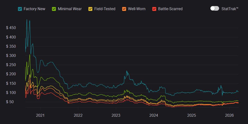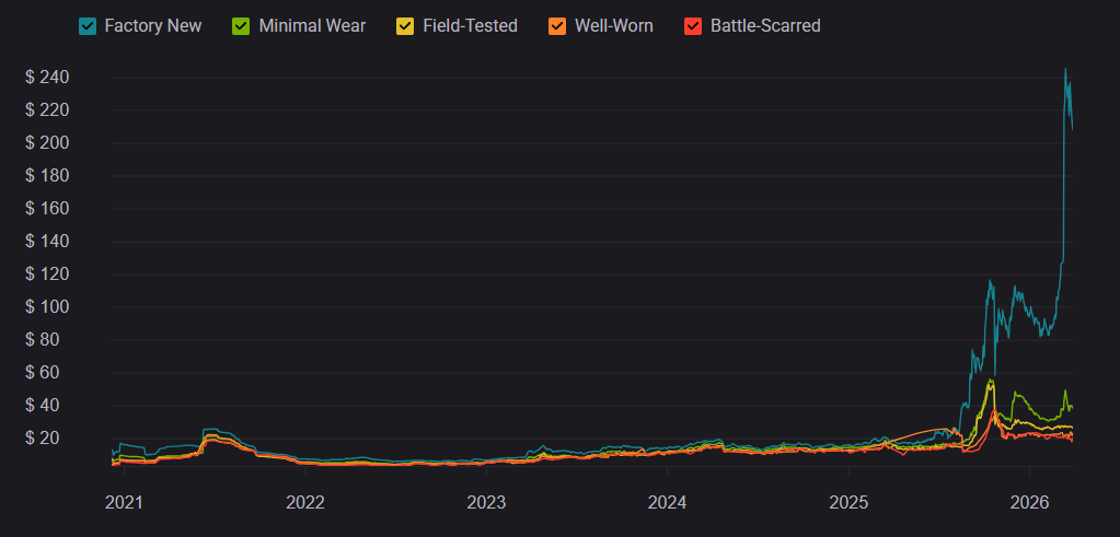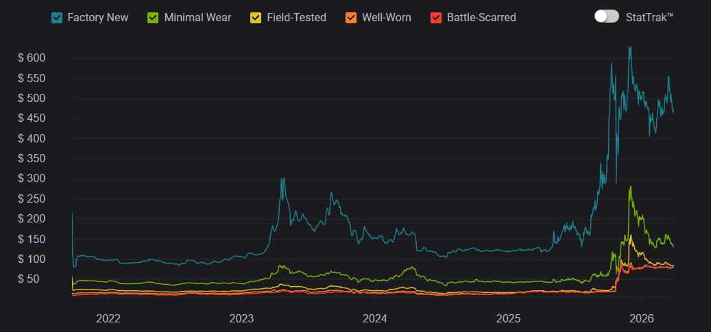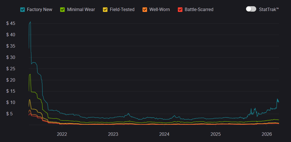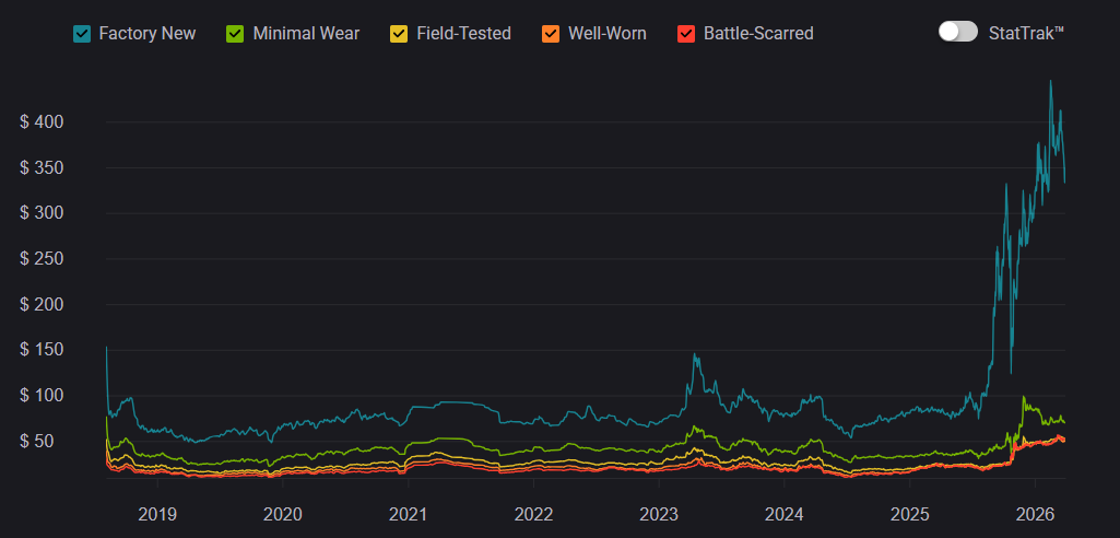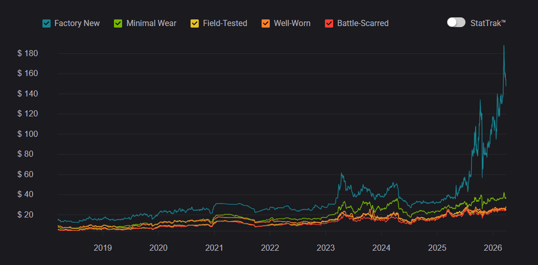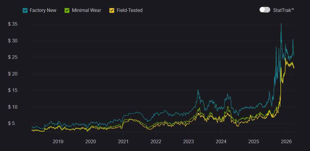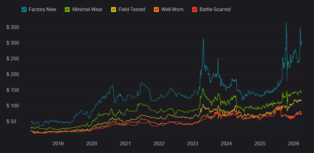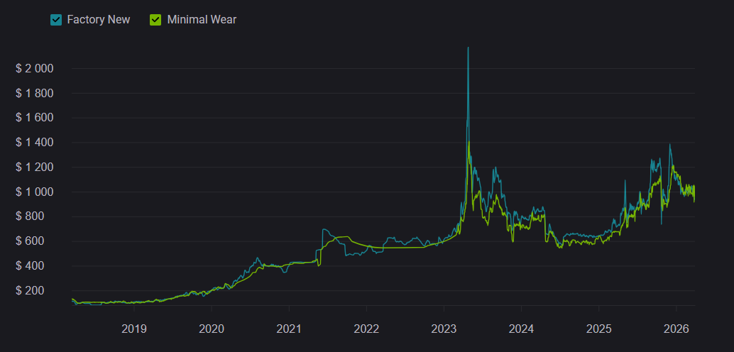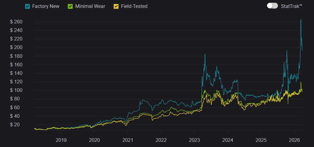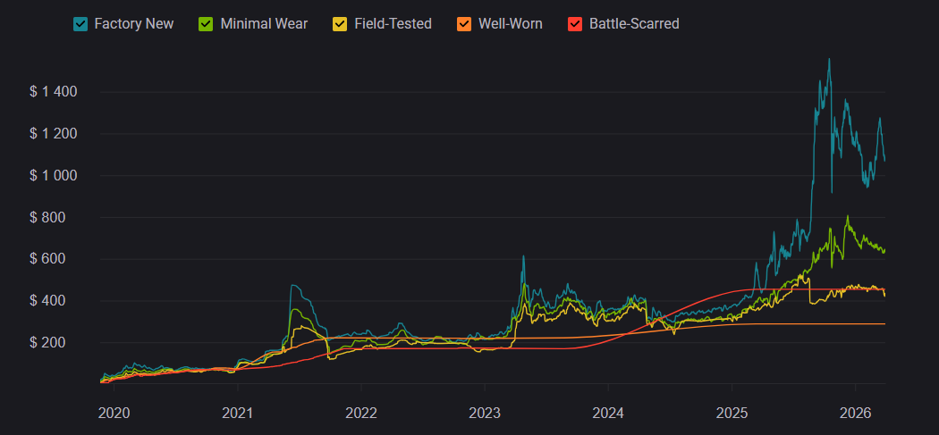 The price of this skin has risen significantly since the introduction of the knife crafting mechanic. To ensure you get a fair price when selling, you can check current prices on various marketplaces at blix.gg.