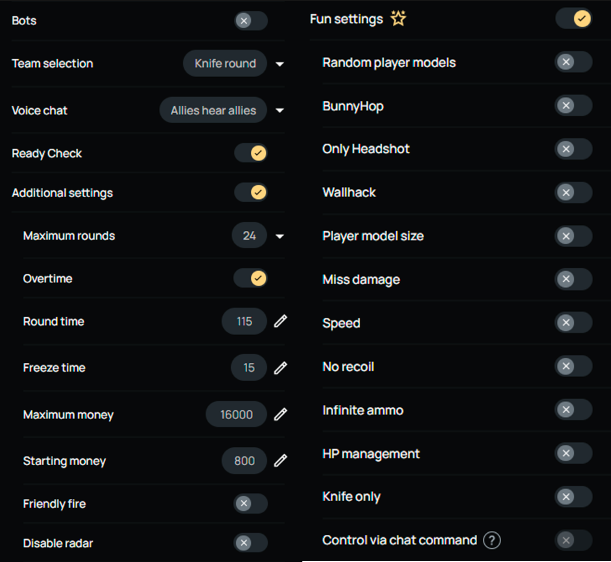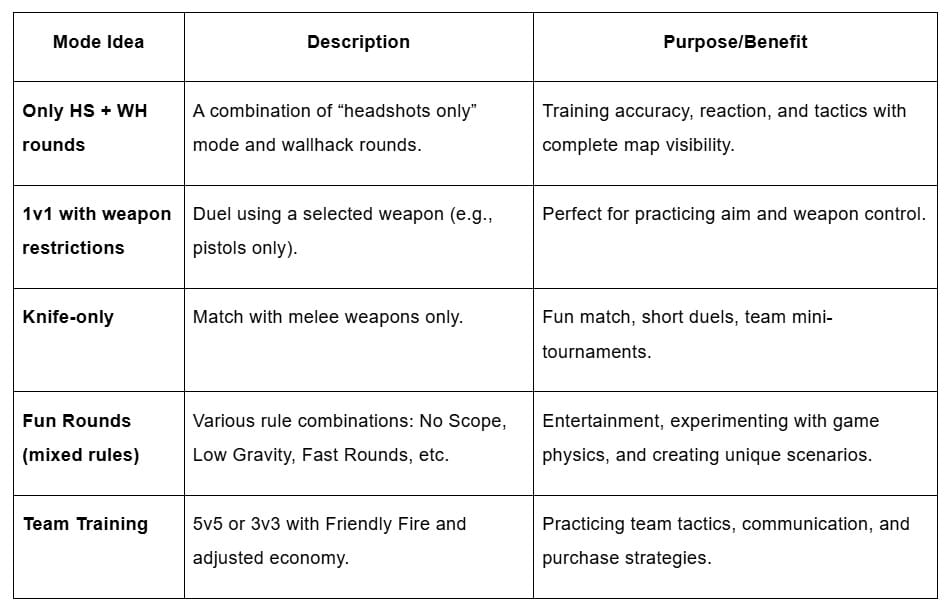 - Fun Rounds: Unique or mixed rules, for example, combining Only HS + damage on miss + Wallhack.