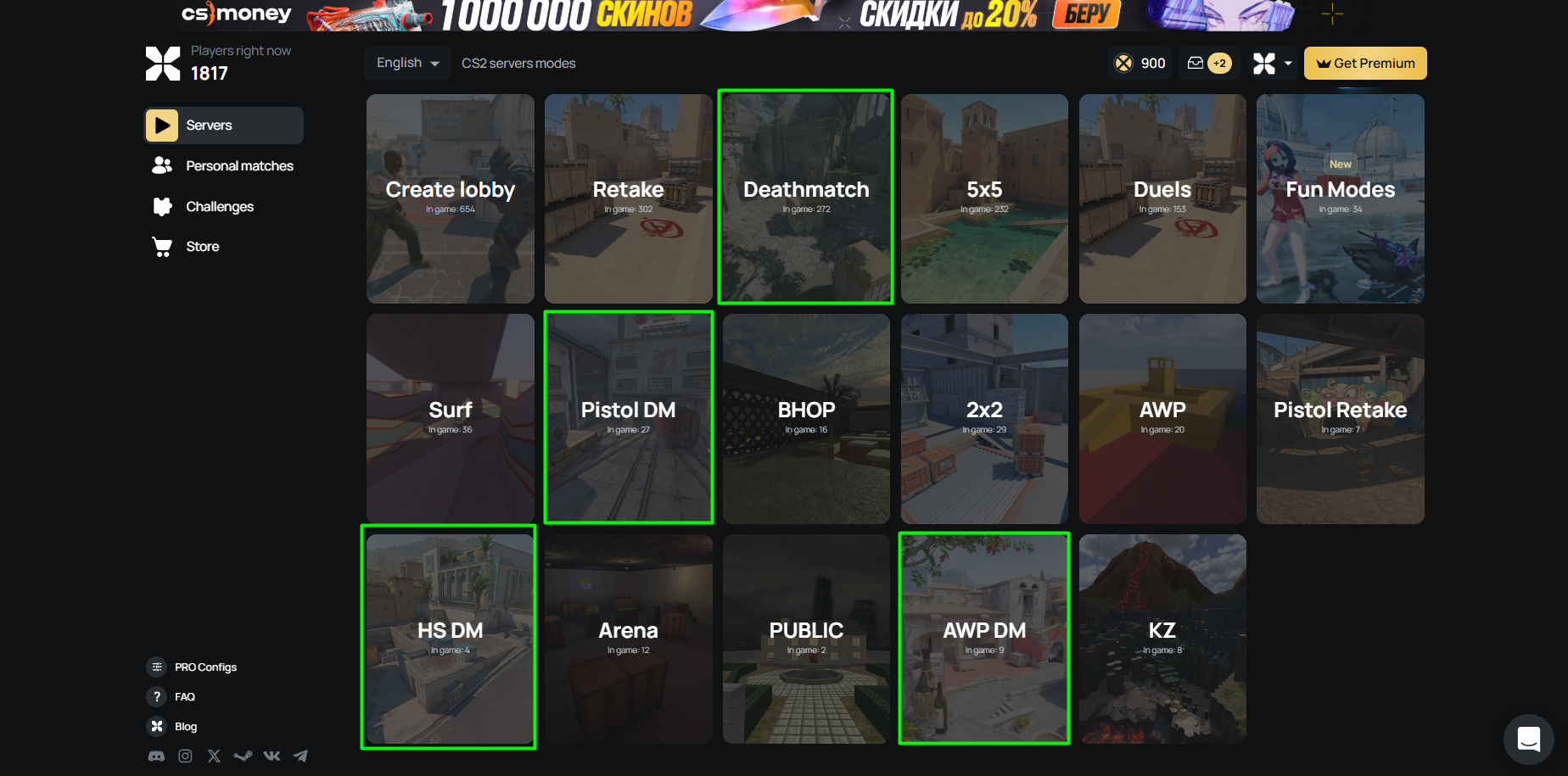 Серверы обеспечивают высокий тикрейт и минимальный пинг, мгновенно реагируют на действия игроков. На платформе доступны все режимы DM — FFA, HS Only, Pistols Only, Rifles Only, а также кастомные тренировочные карты.