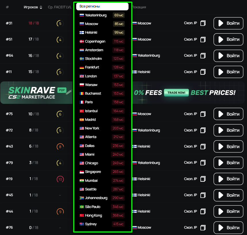 Чтобы подключиться к серверу, достаточно скопировать предоставленный IP или использовать встроенную кнопку “Войти”, которая автоматически открывает игру и подключает вас к выбранному серверу. Для удобства есть фильтры по региону и режиму, что позволяет быстро найти ближайший сервер с низкой задержкой.
