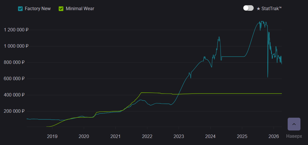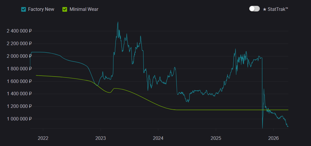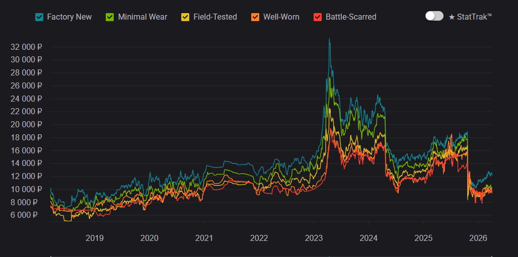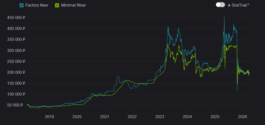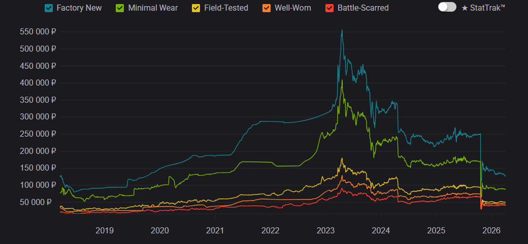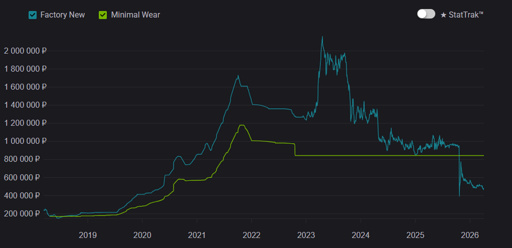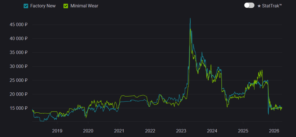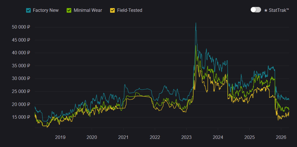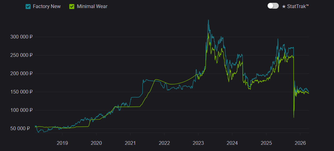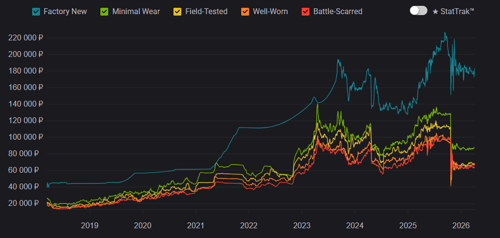 На старте Gamma Doppler воспринимался как нишевая альтернатива классическим Doppler-финишам, но со временем стал одним из самых престижных вариантов. В период 2020–2023 спрос стабильно рос, и к 2026 он закрепился в топе рынка. Однако цены на все фазы Gamma Doppler немного снизились — во многом из-за крафта, где существует ~25% шанс получить Butterfly Knife через трейд-ап с AK-47 | Nightwish из Dreams & Nightmares Case.