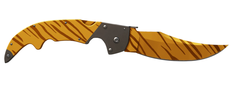 Tiger Tooth отличается яркой жёлтой базой с чёрными тигриными полосами, проходящими по клинку. Цветовая палитра максимально простая, но очень узнаваемая, что делает скин чистым и агрессивным без сложных градиентов или узоров.