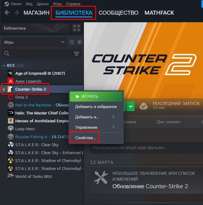 - Найдите Counter-Strike 2 и кликните по игре правой кнопкой мыши.