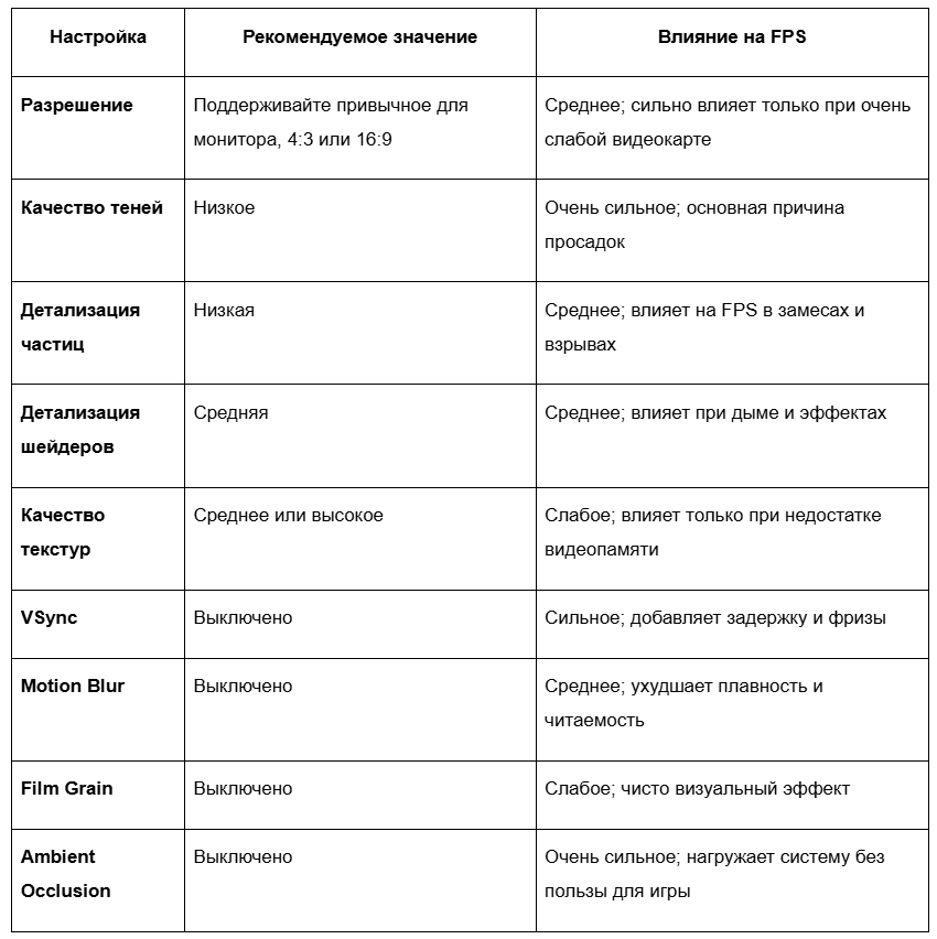 - Детализация моделей и частиц — низкая повышает FPS; текстуры можно оставить средними, если видеопамяти хватает.