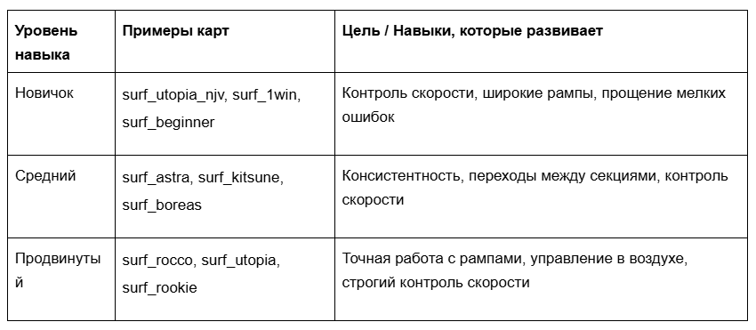 Правильный выбор карты напрямую влияет на прогресс в серфинге CS2. Слишком простые карты быстро теряют интерес, а чрезмерно сложные вызывают раздражение и мешают обучению. Оптимальная карта должна немного выходить за зону комфорта, но при этом оставаться проходимой. Ниже — простой ориентир, который поможет понять, когда пора двигаться дальше и как выстраивать тренировки.