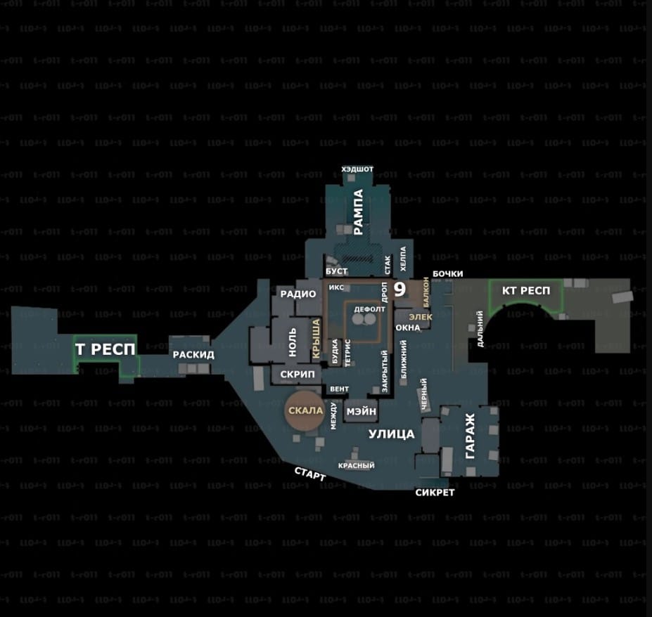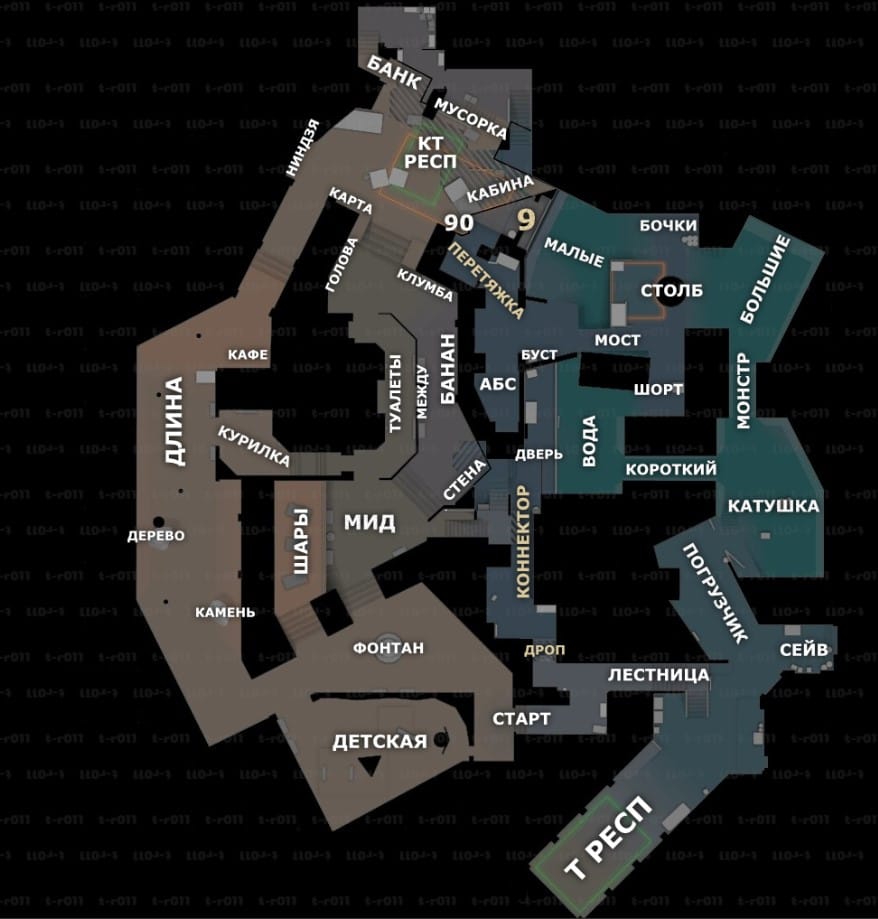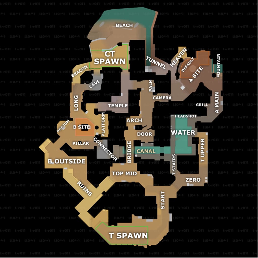 T-Spawn — стартовая точка для террористов, предоставляющая несколько путей на оба сайта. Ранний контроль Outside, Lobby или Secret открывает путь к A и B и позволяет давить на защитников.