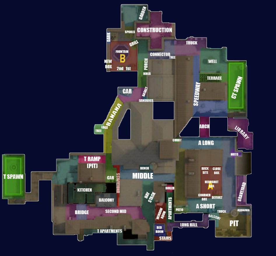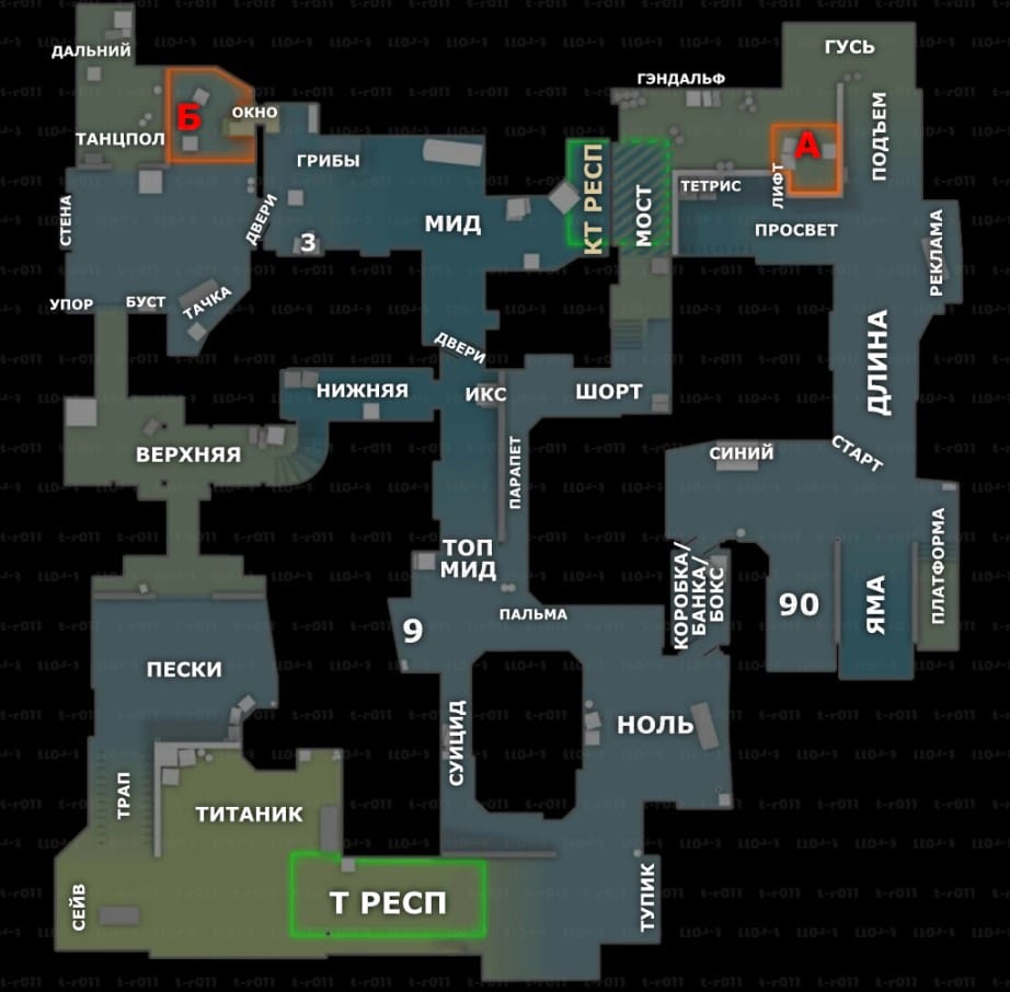 - Alley — соединяет CT Spawn с задними коридорами и в конечном итоге с Point B.