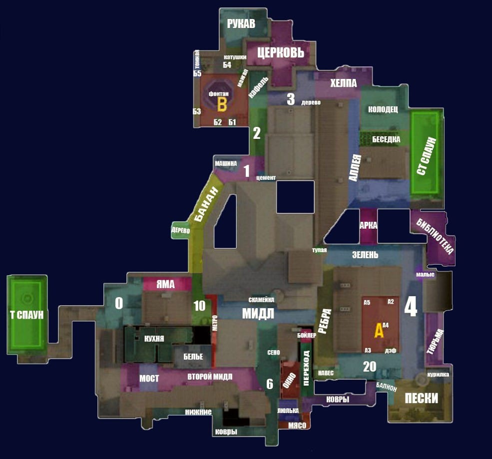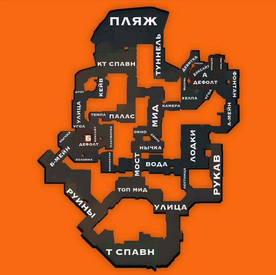 Overpass — уникальная карта, известная открытыми пространствами и вертикальностью, а не только двумя уровнями. A и B сайты предлагают несколько подходов и углов. Ключевые зоны для контроля: Mid, Playground, Water, Connector, Bathrooms. Контроль этих позиций позволяет команде влиять на ход раунда и быстро реагировать на движения противника.