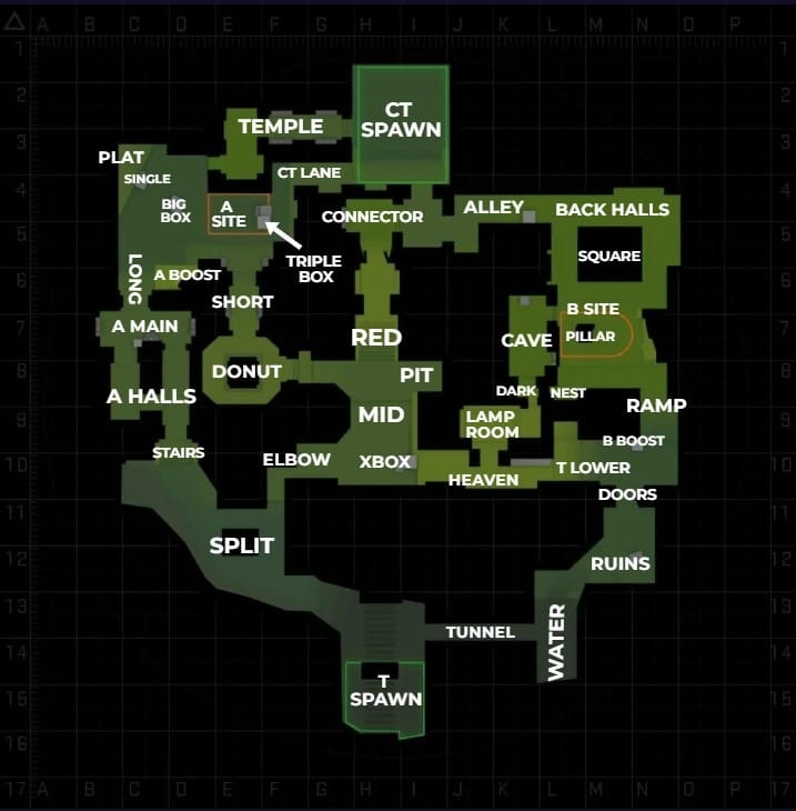 CT-Spawn — ключевая точка ротации, позволяющая быстро помогать любому сайту. Рядом с A Site Big Box и Hut дают укрытие для удержания или ритейка сайта. Другие важные позиции: