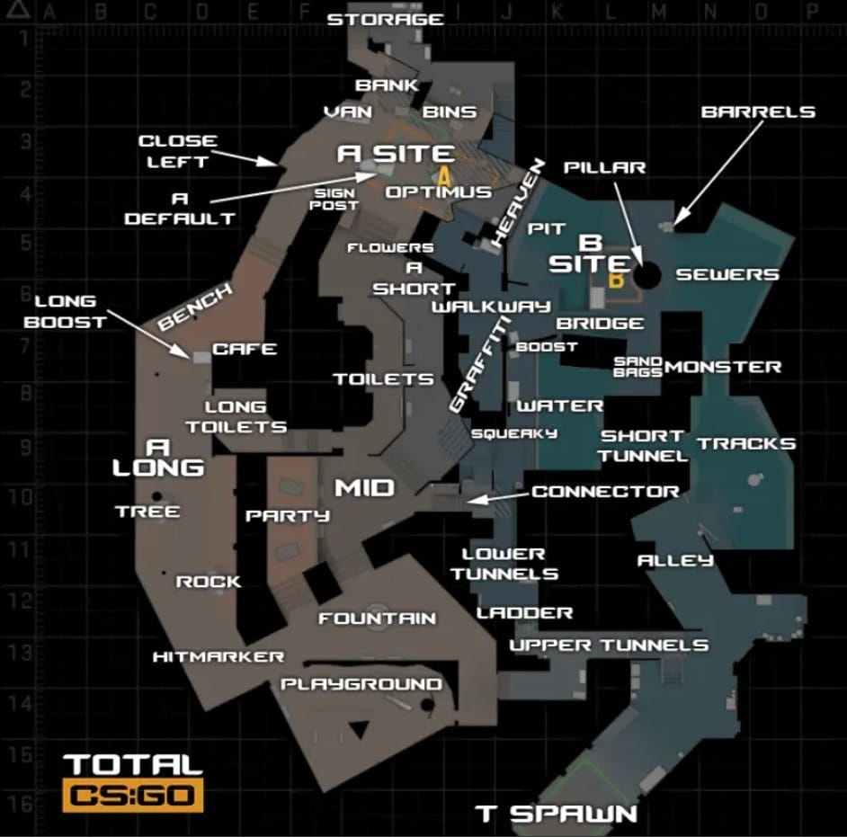 - Tunnel — соединяет точку возрождения террористов с водой, часто используется для атаки на B.