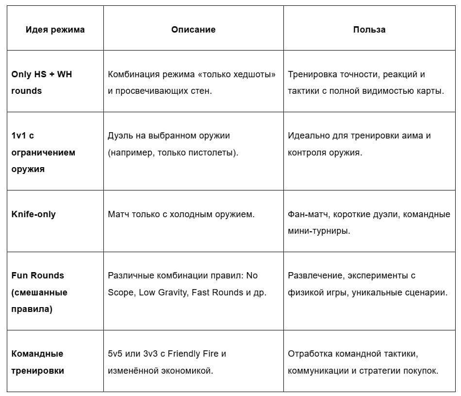 - Fun Rounds: уникальные и смешанные правила, например сочетание Only HS + урон за промах + Wallhack.
