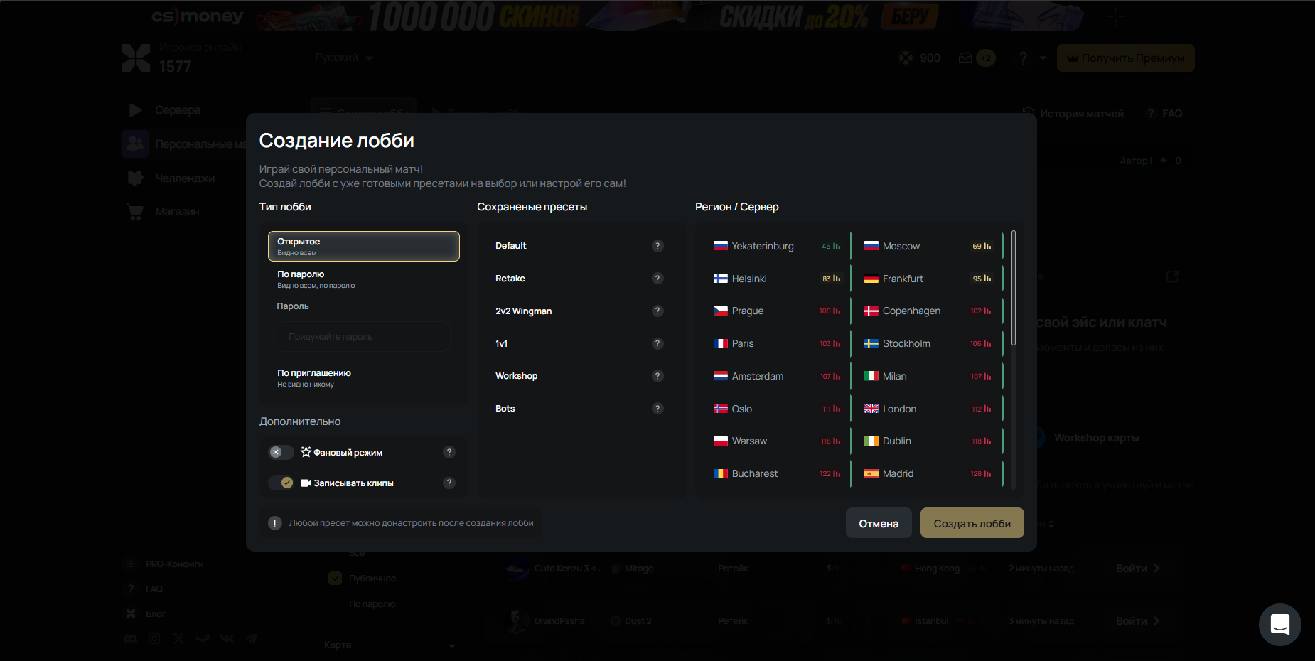 Создание пресонального матча на xplay.gg — процесс простой и интуитивно понятный, даже если вы впервые работаете с кастомными матчами. Сначала необходимо авторизоваться на платформе через аккаунт, чтобы получить доступ к управлению лобби и настройкам матчей. После входа нажмите на кнопку создания нового лобби, где вы сможете выбрать игру и основные параметры матча. Выберите открытое оно будет или закрытое, локацию и режим игры.