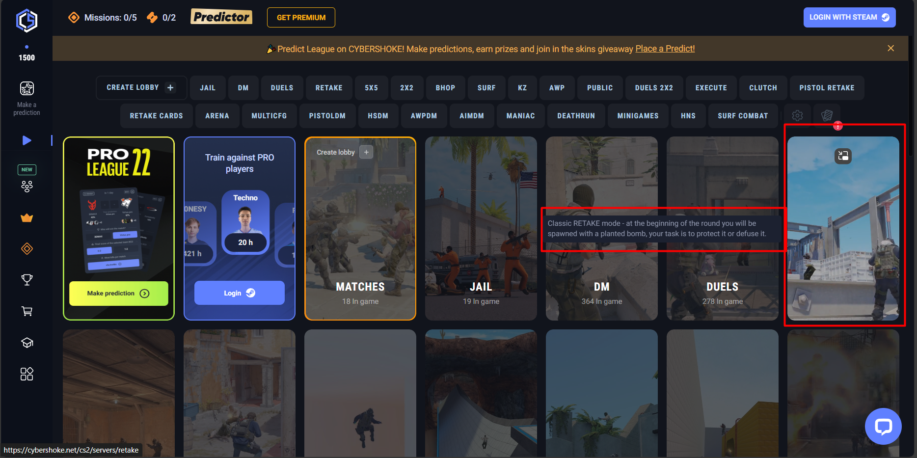 На платформе доступны различные карты для режима Retake, позволяя игрокам выбирать подходящие условия для тренировки.