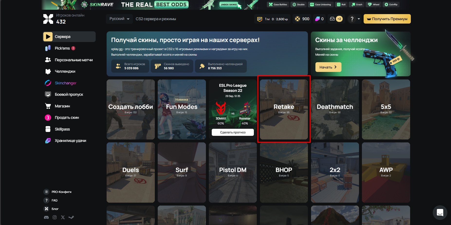 Кроме Retake, ESportal предлагает другие игровые режимы, такие как Casual и Competitive, что даёт игрокам возможность разнообразить тренировочный процесс.