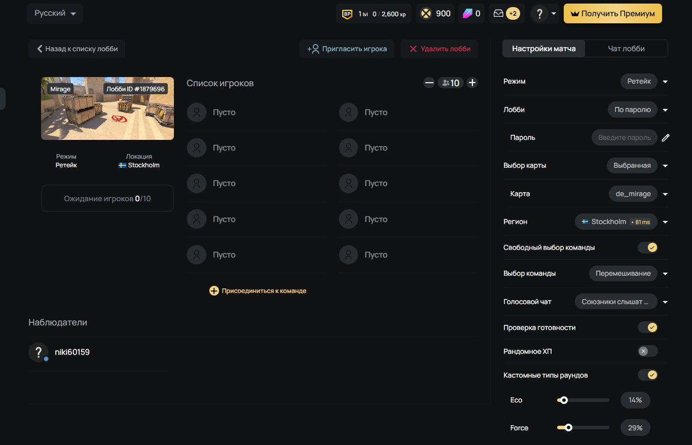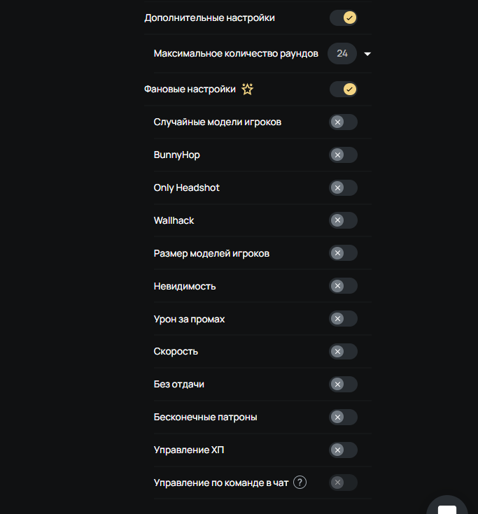 При создании сервера доступны расширенные настройки: количество ботов, выбор карты, частота кастомных раундов (eco, force, full buy), максимальное количество раундов и даже фановые режимы вроде wallhack, бесконечных патронов или bunny hop. Такая гибкость позволяет тренироваться как в условиях настоящего матча, так и в развлекательных сценариях.