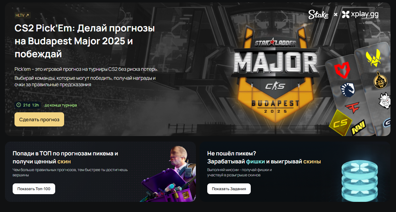 Мы рады объявить, что на xplay.gg запускается пикем к Starladder Major, и в этот раз он выходит ещё интереснее благодаря партнёрству со Stake. Уже совсем скоро вы сможете сделать свои прогнозы, следить за ходом турнира и побороться за крутые скины — как в стандартном лидерборде, так и через новую механику, о которой расскажем ниже.