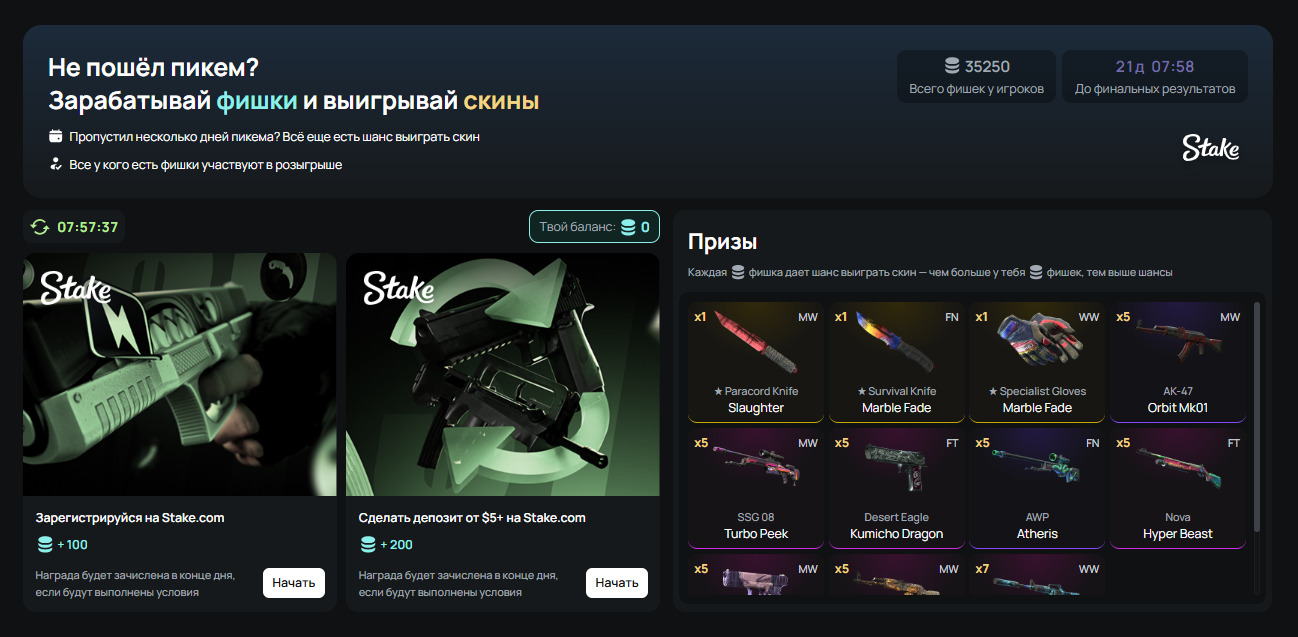 - Чем больше фишек — тем выше шанс получить скин в отдельном розыгрыше.